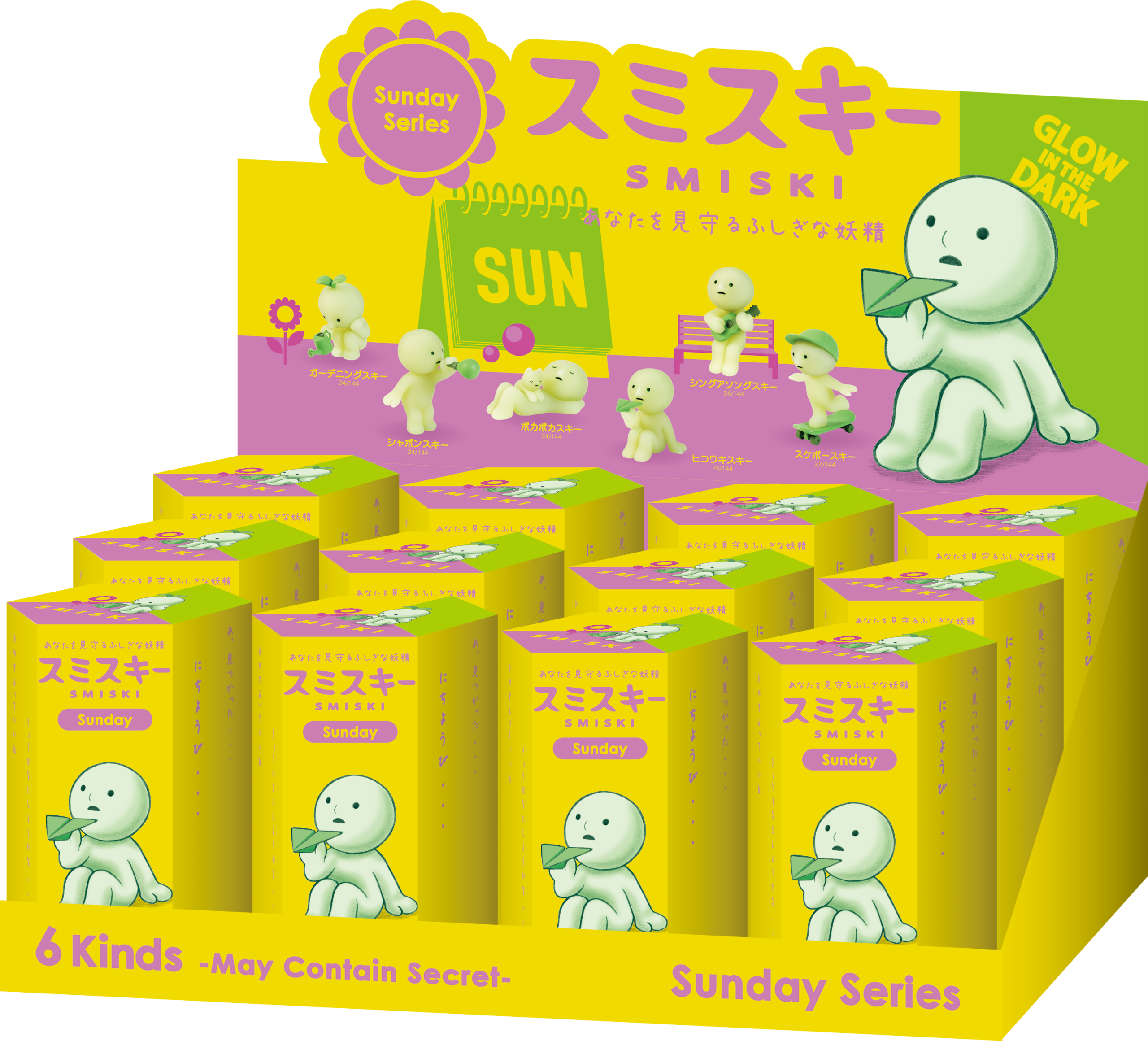 The lineup features 6 kinds + 1 secret figure and includes SMISKI Sing-Along who sings and plays guitar. SMISKI Sunbathing who naps in the warm sun with a furry friend. and SMISKI Skateboarding who’s ready for fun on the go. A day off spent with SMISKI is always refreshing.
